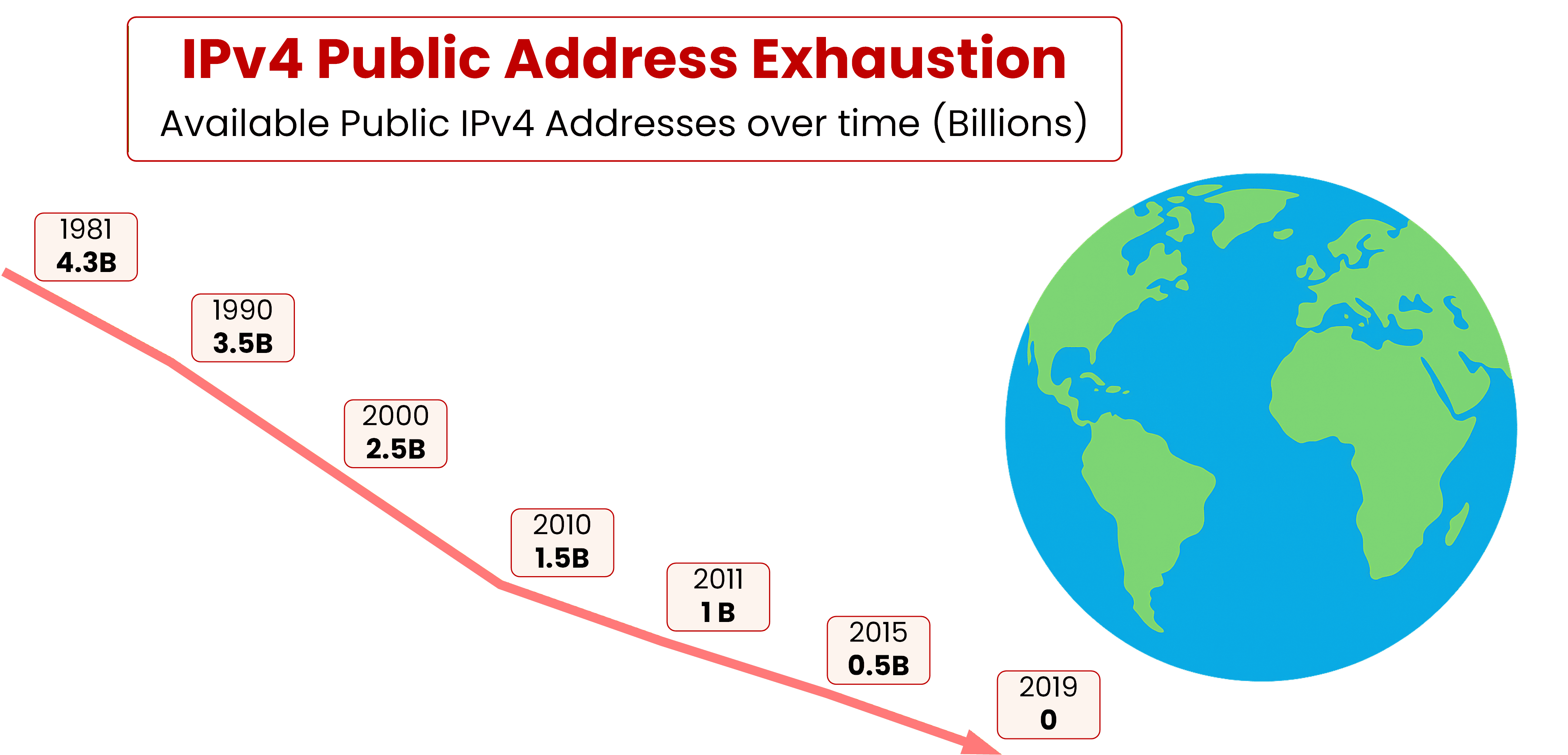 Back in 1981, the IPv4 Public Address space was designed with about 4.3 billion unique addresses. At that time, the creators of the Internet did not anticipate how massive adoption would become.Over the years, public IPv4 addresses managed by IANA and the Regional Internet Registries (RIRs) allocated worldwide. As more networks and devices were deployed, the number of available public addresses kept shrinking.
